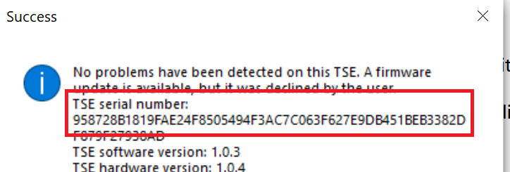Sollten Sie diese nicht sehen können, gehen Sie folgt vor. Bitte folgendes Programm installieren: https://hotelsoftware.at/zimmersoftware/hp/swissbit-tse-maintenance-tool-setup.exe Es kann sein, dass bei der Installation auch die C# Runtime installiert werden muss, dies bitte bestätigen. Wenn das Tool gestartet ist, dann den Laufwerksbuchstaben der TSE eintragen und Check TSE klicken: ![]() Eventuelle Firmwareupdates mit Nein beantworten: ![]() Im folgenden Popup wird dann die Seriennummer angezeigt: ![]() Am Desktop werden auch logfiles generiert, diese können Sie löschen. | |